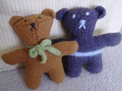 Well, I knit and felted these two bears a while back. I pulled them out of the vault (a.k.a my closet) just yesterday. These were the first items I ever felted and the lesson I learned is that wool does not shrink the same vertically as it does horizontally. Just look how they shortened up and got wider. Oh well, still works for hugging and playing.